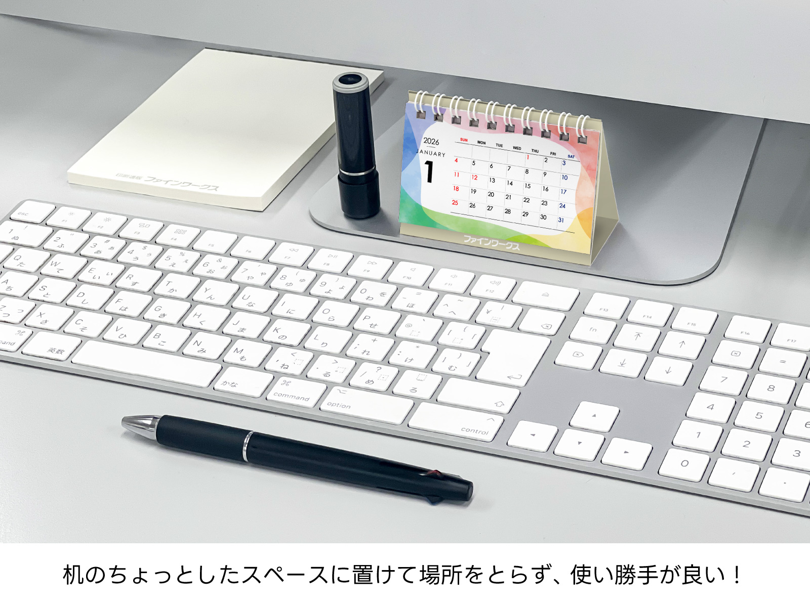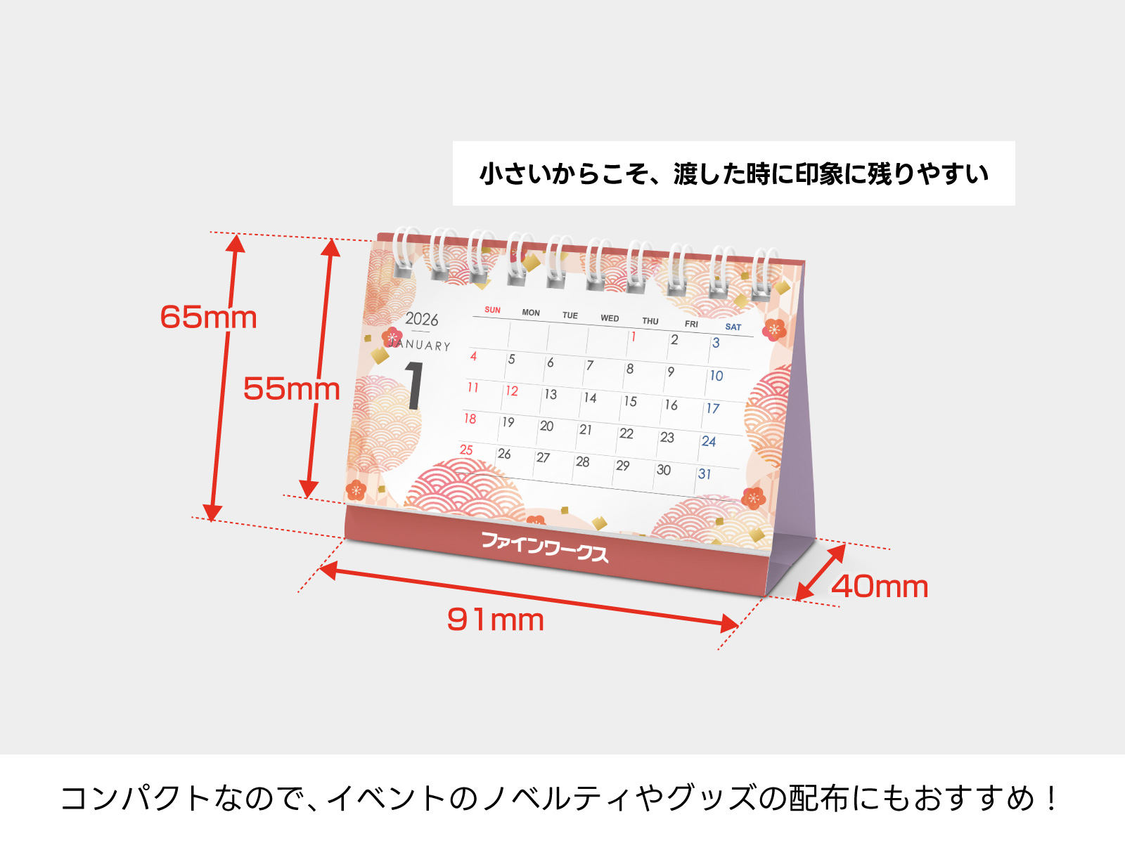 名刺サイズなので置き場所を選ばず、机や受付、カウンターなどでも邪魔になりません。小さいカレンダーだからこそ受け取った側の印象にも残り、長く使っていただける卓上カレンダーです。