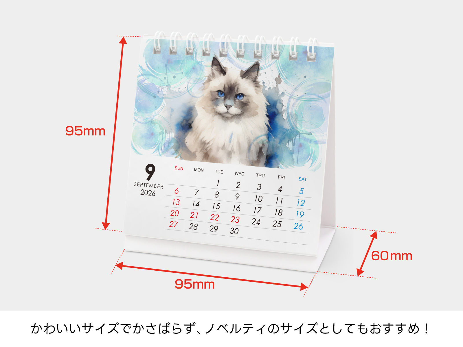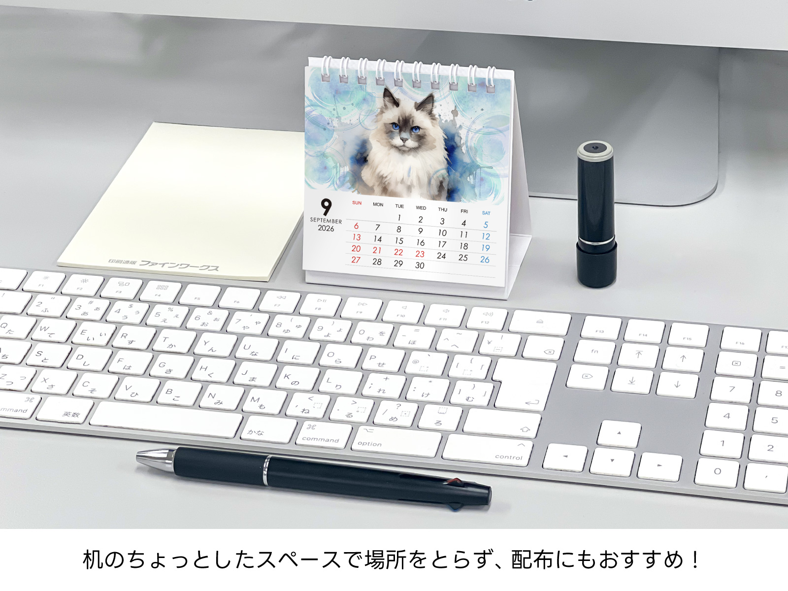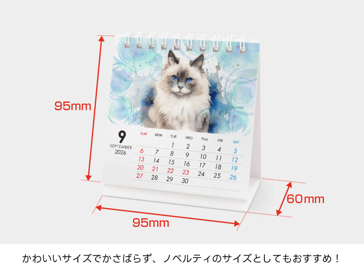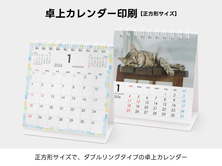 オリジナルデザインを正方形サイズで作成し印刷したカレンダーをダブルリングで綴じるタイプの卓上カレンダー。机の狭いスペースでも場所をとらずに置けます。7枚綴りと13枚綴りをお選びいただけます。