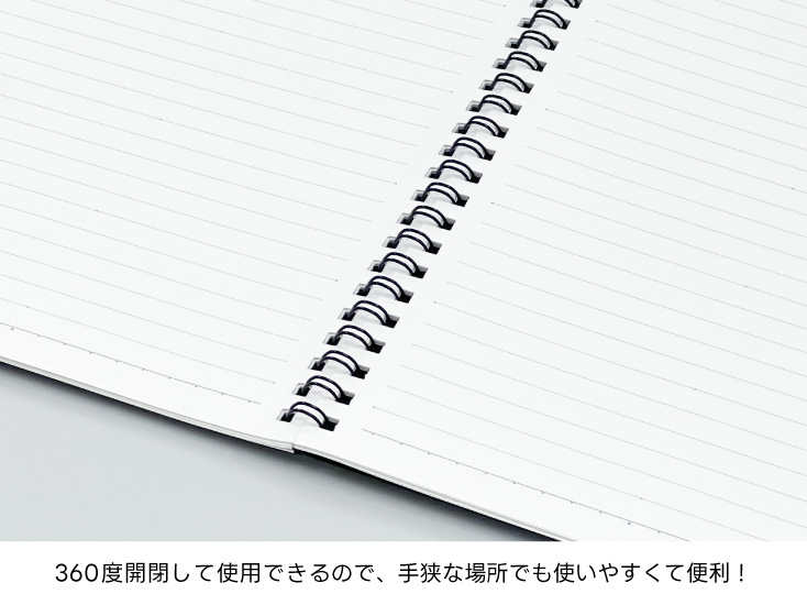 リングタイプのノートは、ページを360度開くことができるため手狭な場所での使用にも最適。