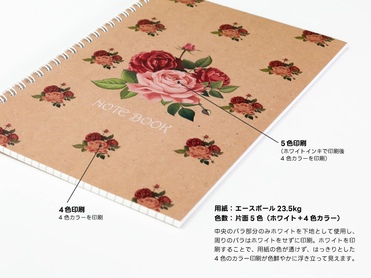 ホワイトをカラーの下地として使うことで、用紙の色が透けず、はっきりとした印刷映りに仕上がります。