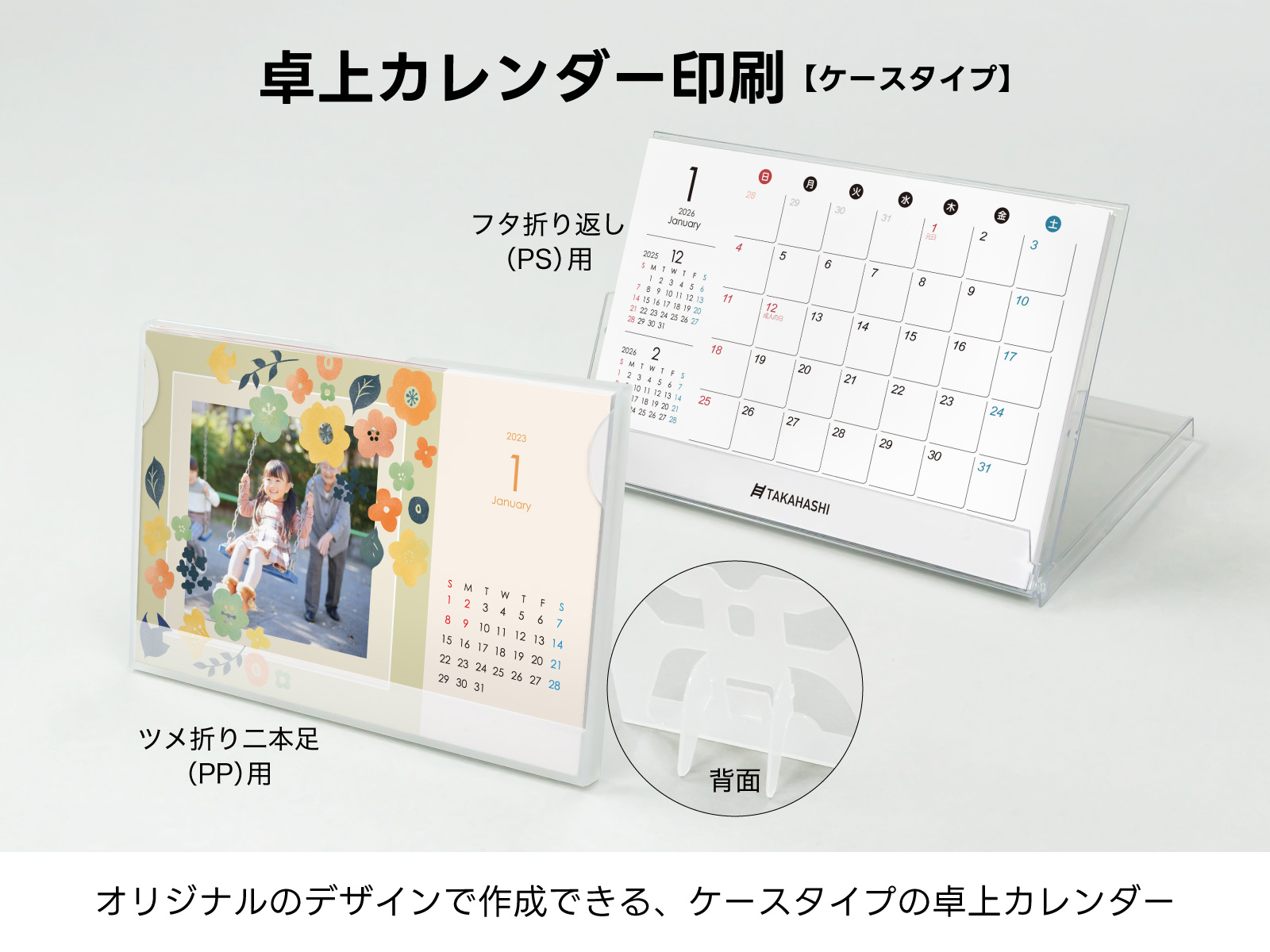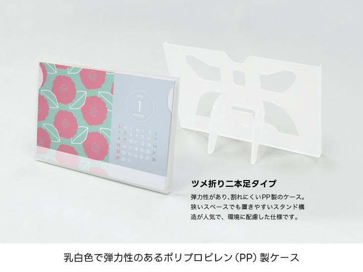 オリジナルのデザインで制作できる、ケースタイプの卓上カレンダー。ケースにセットできるカレンダーのサイズはポストカードサイズです。ケースは2種類で、「ツメ折り二本足」は乳白色で弾力性のあるポリプロピレン(PP)製ケースと、「フタ折り返し」は透明で固いポリスチレン(PS)製ケースを選べます。