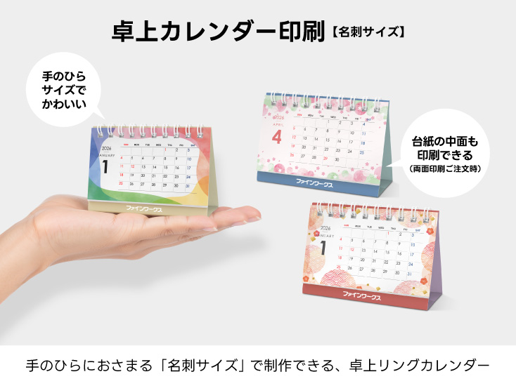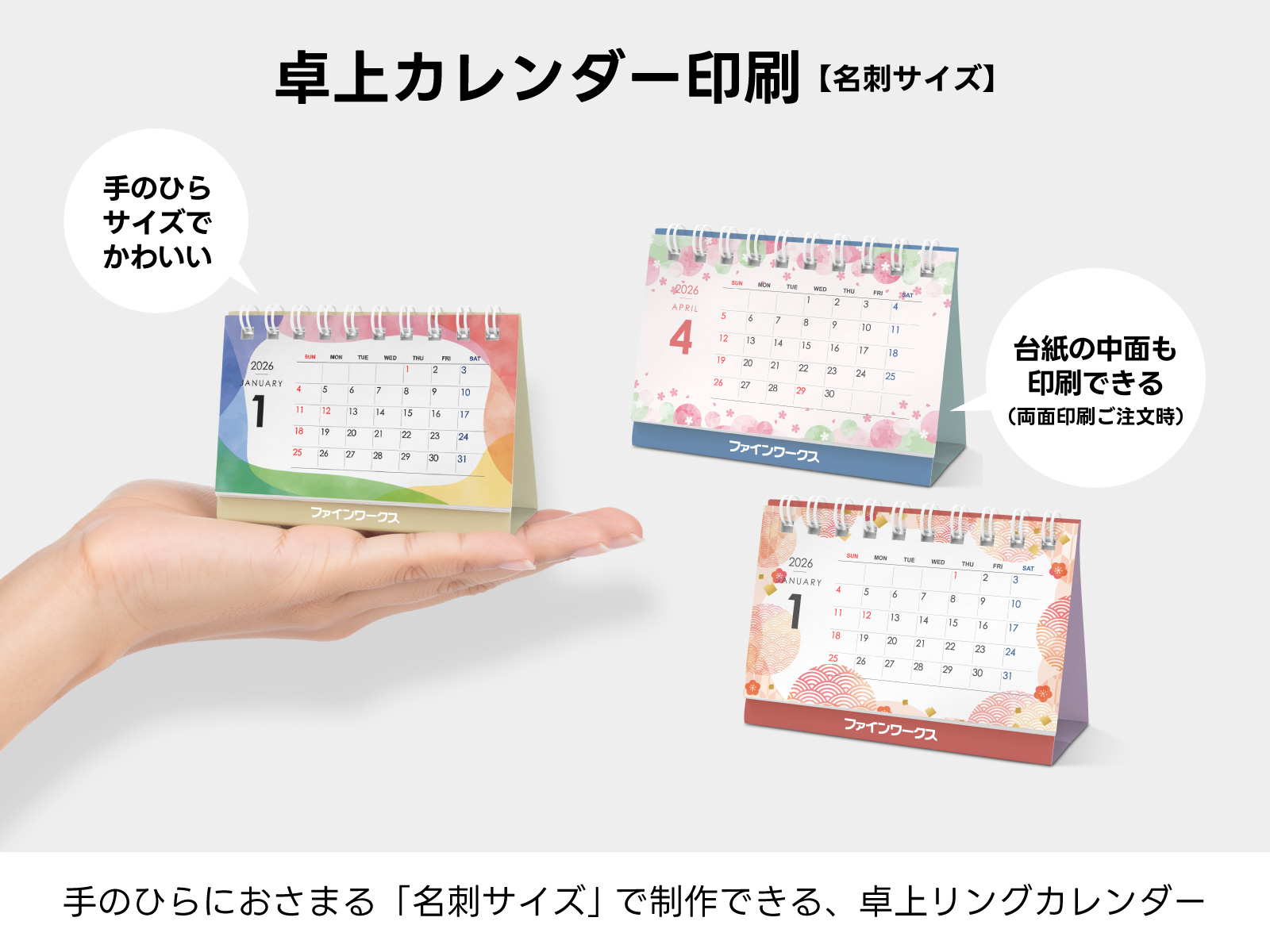 名刺サイズなので置き場所を選ばず、机や受付、カウンターなどでも邪魔になりません。小さいカレンダーだからこそ受け取った側の印象にも残り、長く使っていただける卓上カレンダーです。