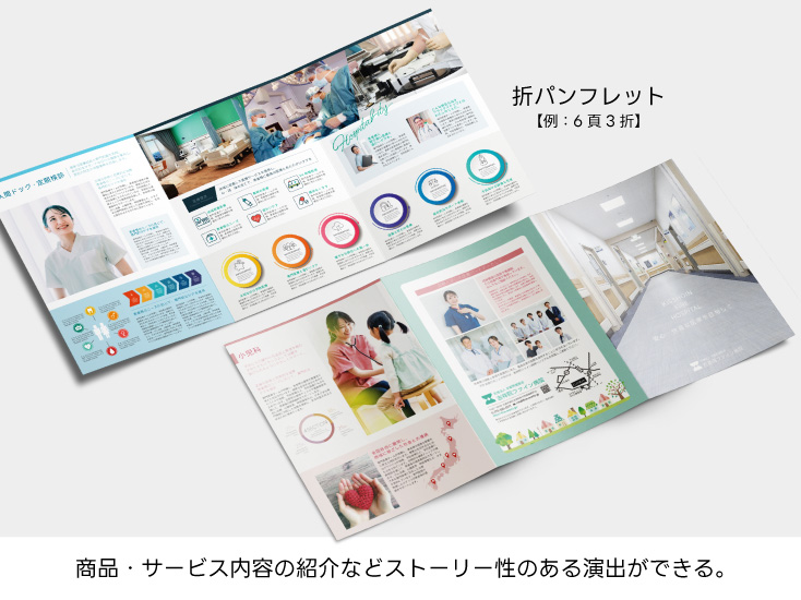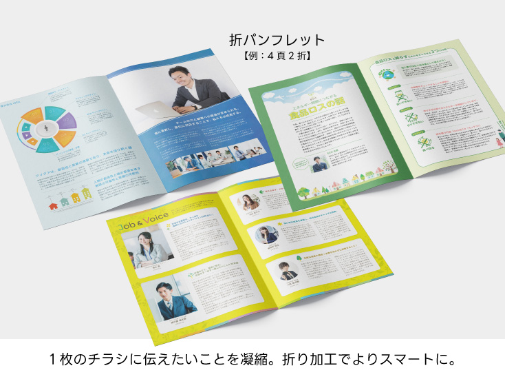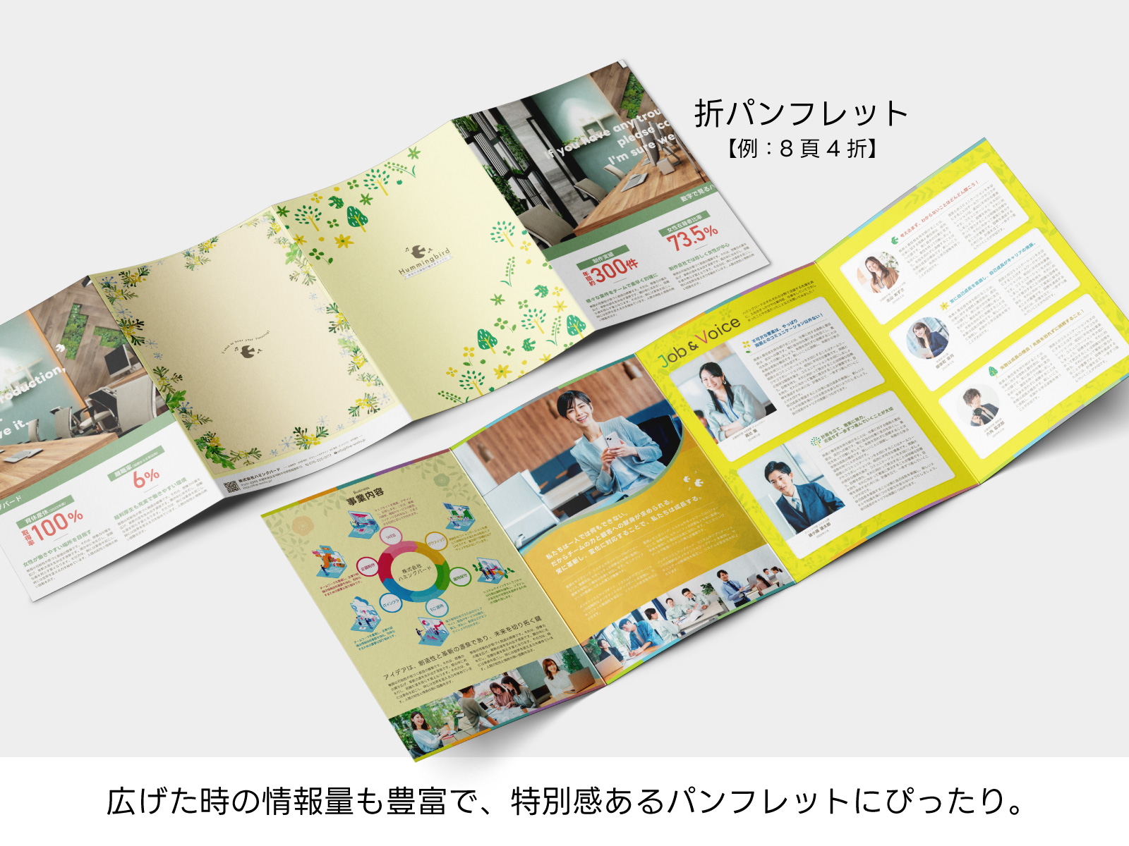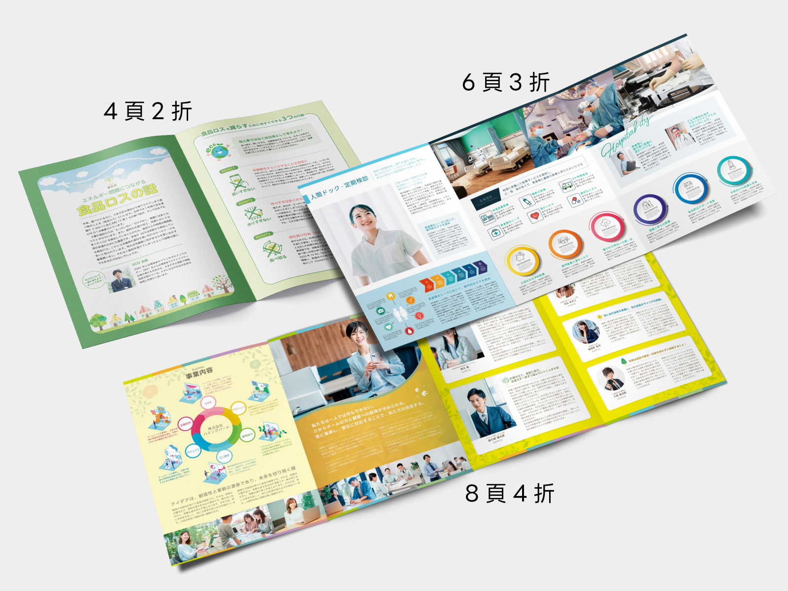 折りの種類も多いので、デザインを工夫してインパクトのあるパンフレットが出来上がります。